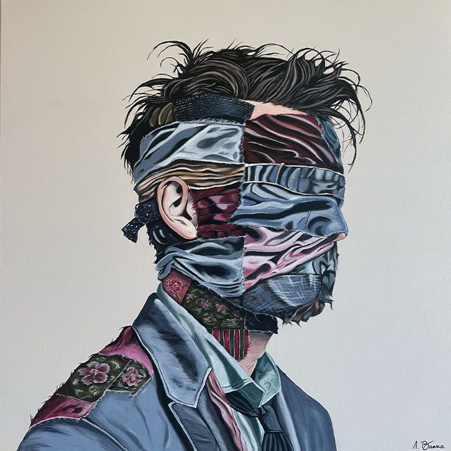 This piece explores the weight of unspoken experiences. The man’s face is wrapped in fabric fragments — symbolic layers of memory, pain, nostalgia, and the emotions he does not express out loud. Silence becomes a form of identity, shaping how he sees the world and how the world sees him. His story is hidden beneath the patterns, revealing that some identities are built not from what we say, but from what we hold inside.